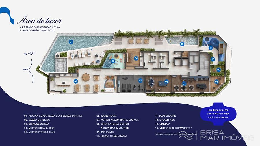 Estrutura de Lazer: Piscina adulto, piscina infantil, solarium, sauna, spa, academia, brinquedoteca, playground, salão de festas, espaço gourmet, sala de jogos, cinema, coworking, espaço zen, quiosque com churrasqueira, bicicletário e pet place.
