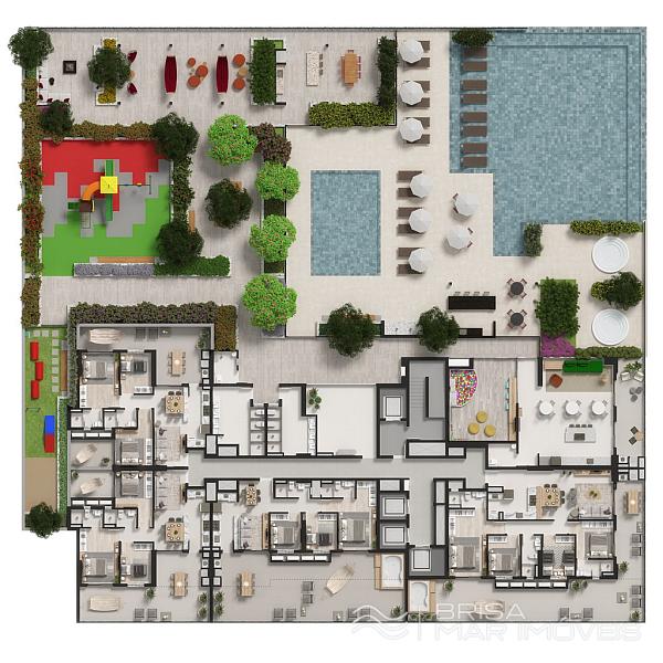 • 6º pavimento (lazer frente mar): piscina adulto com borda infinita, piscina infantil com prainha e splash, deck molhado, bar seco, quiosques, spas, praça do fogo, redário, playground, salão gourmet, brinquedoteca e espaço pet.