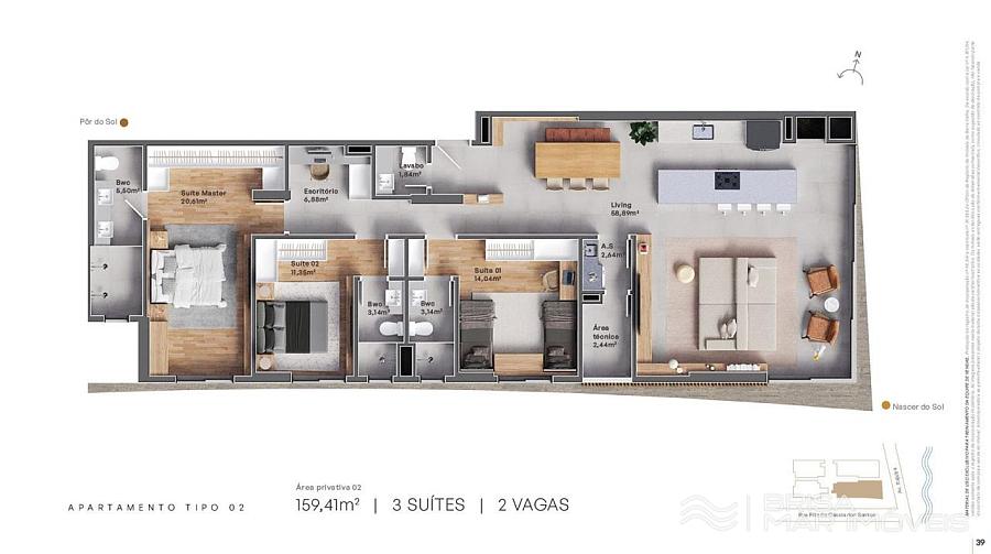 Plantas Final 01 e 02 Frente mar 3 suítes de 140,72m² e 159,41m² privativos
