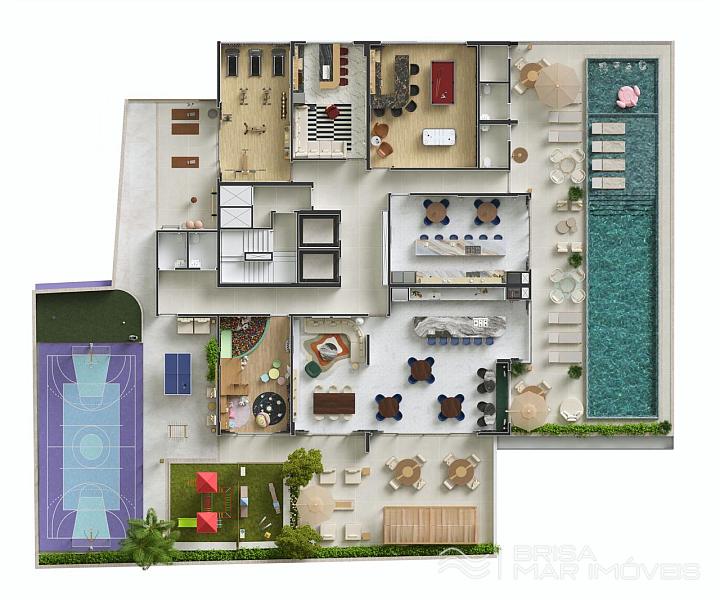 A área de lazer está situada no 3º pavimento, entregue completamente mobiliada, equipada e climatizada, oferecendo uma experiência de lazer completa, com ambientes sofisticados e pensados para toda a família.