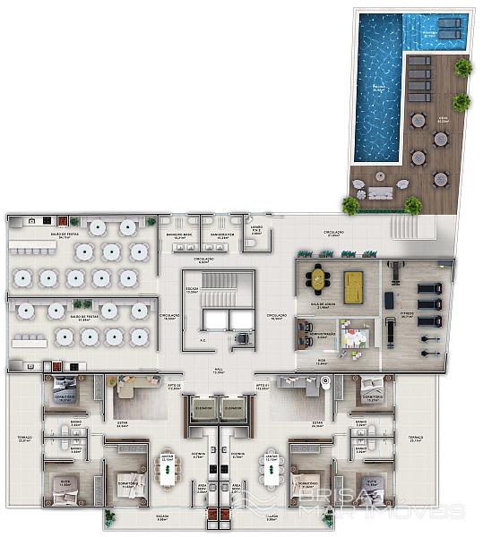 Estrutura de Lazer: Piscina, Prainha, Deck Molhado, Academia, 2 Salões de Festas e Brinquedoteca.