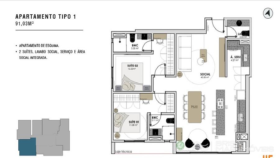 • TIPO 01: 2 Suítes – 91 m² | Living Integrado