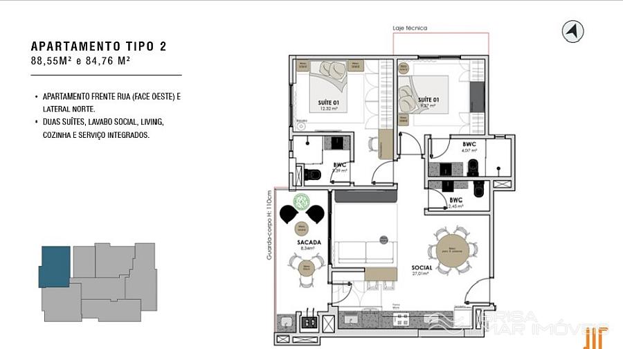 • TIPO 02: 2 Suítes – 88,55 m² e 84,76 m² | Sacada com Churrasqueira