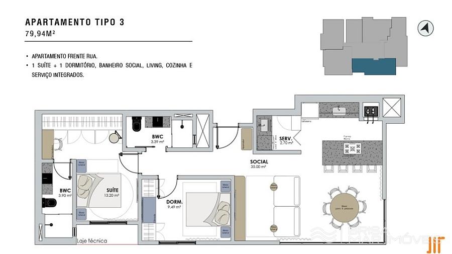 • TIPO 03: 1 Suíte e 1 Dormitório – 79,94 m² | Living Integrado